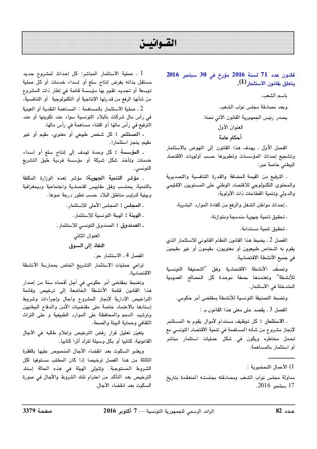 قانـون عدد 71 لسنة 2016 المتعلق بقانون الإستثمار Code D Investissem