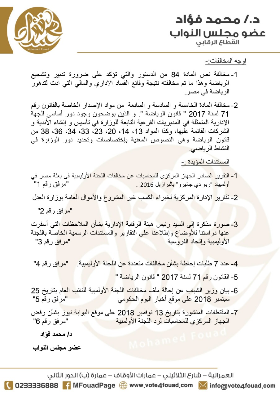 النائب محمد فؤاد يتقدم باستجواب لوزير الشباب مواجهة الفساد واجبة و السكوت عنه مشاركة فيه تحت القبة بوابة البرلمان
