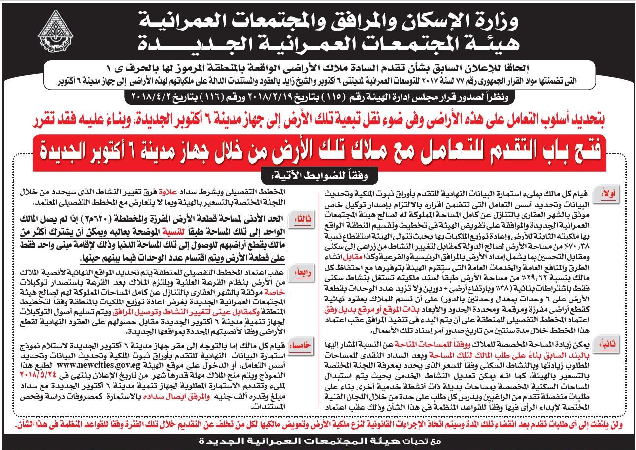الإعلان عن فتح باب التعامل على الاراضى الواقعة بالمنطقة المرموز لها بالحرف ي1 بناءا على الطلبات المقدمة من ملاكها بمدينة 6 أكتوبر الجديدة تاريخ الإعلان 2018 04 24 لطباعة النموذج من فضلك اضغط هنا تاريخ نهاية الإعلان 2018 05 24 إعلانات الهيئة طرح عدد 12 محلا